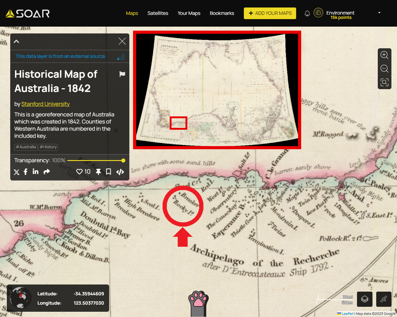 Our first clue was from legendary reports by old pirates who sailed those southern seas. See that dot circled in red on that ancient-looking map of Australia from 1842?