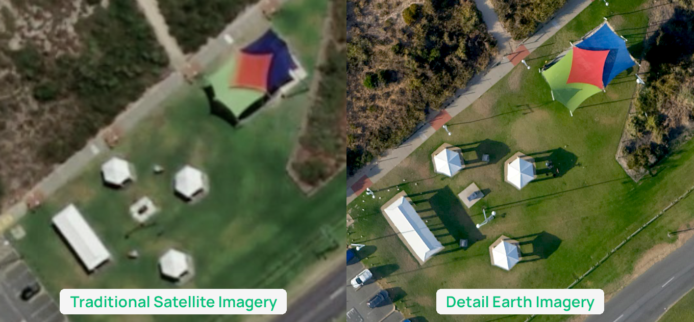 While satellite imagery varies in resolution and often misses fine-grained objects, Detail Earth imagery is crisp, colourful, and incredibly accurate. You’ll be able to see things like powerlines on poles, the shape of individual cars on the road, and the textures that traditional imagery often blurs out. The difference is night and day!